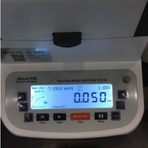用一定量塑料顆粒,置于不銹鋼托盤中,用鑷子將塑料顆粒平鋪均勻,溫度設(shè)置105℃用儀器進(jìn)行加熱,10分鐘后檢測結(jié)束,檢測數(shù)據(jù)顯示0.045%;為了檢測儀器的精確性,待儀器溫度降至50℃以下時進(jìn)行第二次測量,用實驗勺提取8克塑料顆粒,置于不銹鋼托盤中,用實驗勺將塑料顆粒平鋪均勻,溫度設(shè)置105℃用儀器進(jìn)行加熱,10分鐘后檢測結(jié)束,檢測數(shù)據(jù)顯示0.057%;?用實驗勺提取8克塑料顆粒,置于不銹鋼托盤中,用實驗勺將塑料顆粒平鋪均勻,溫度設(shè)置105℃用儀器進(jìn)行加熱,10分鐘后檢測結(jié)束,檢測數(shù)據(jù)顯示0.053%。實驗結(jié)果所得數(shù)值較為準(zhǔn)確,儀器檢測精度較高。