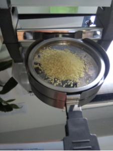 第三步,往測試樣品盤上倒入樣品,不宜過多,也不宜太少,一般取5~10克即可。(不同產(chǎn)品取的克重不同)。雞精我們?nèi)?克來測量即可