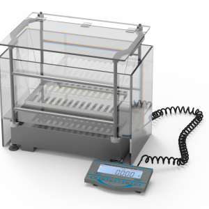 2、測量空氣中重量完成之后,將樣品放入量測籃上的抗浮架之下待穩(wěn)定后即顯示視密度值